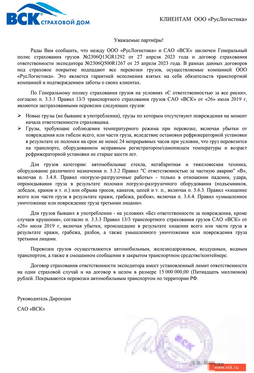 Учитывая большой объем ответственности, которая «ложится на плечи перевозчика» при доставке груза, наша компания приняла решение максимально обезопасить свою деятельность и заключила договор страхования в САО «ВСК». Страховка покрывает большой объем страховых рисков с лимитом ответственности 15 000 000,00 рублей по одному случаю. Таким образом, наш клиент защищен от всех возможных проблем по пути следования автомобиля. Работая с ООО «ГТЛ», Вы работаете с надежным перевозчиком, который избавляет Вас от рисков и угроз в процессе перевозки груза!