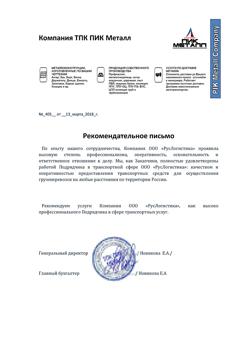 Генеральные директор ООО «ТПК ПИК МЕТАЛЛ» Новикова Е.А.